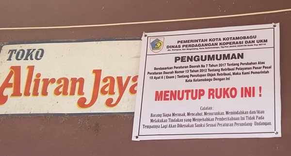 Kepala Dinas Perdagangan, Koperasi- UKM Kotamobagu, Herman Aray mengatakan, pemasangan tanda penutupan terhadap 20 Ruko sudah sesuai. Surat Peringatan Ketiga (SP-3), ke 20 ruko belum membayar tunggakan retribusi selama 10 Bulan.