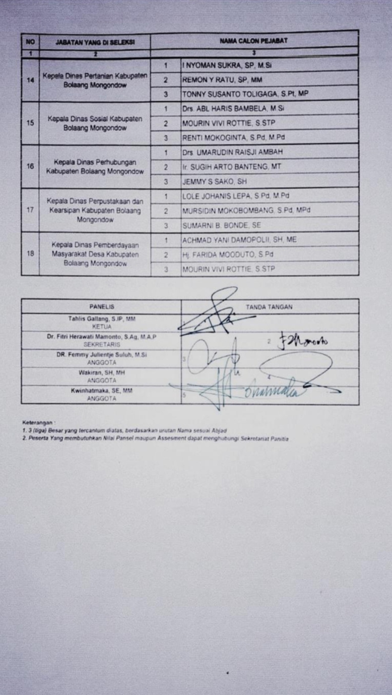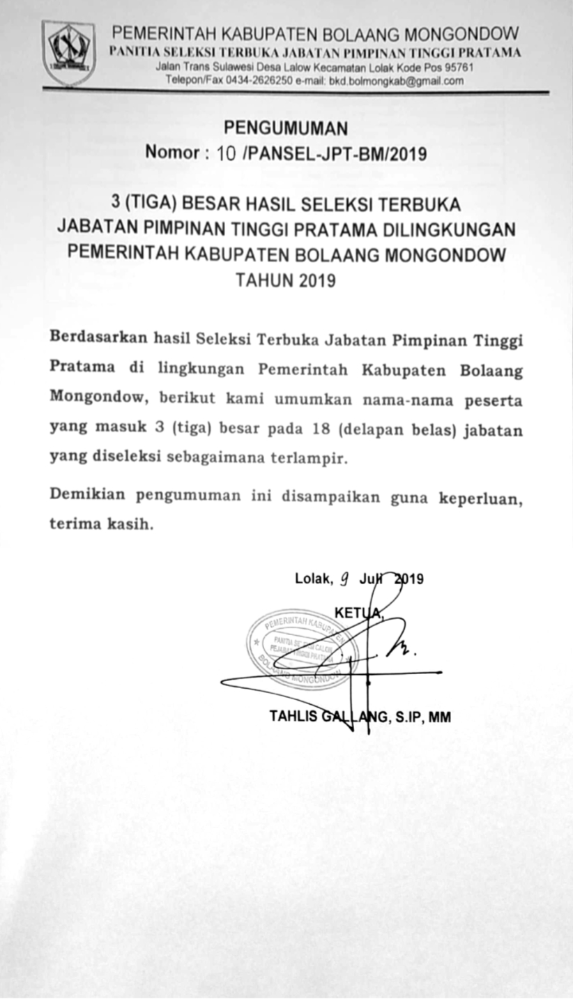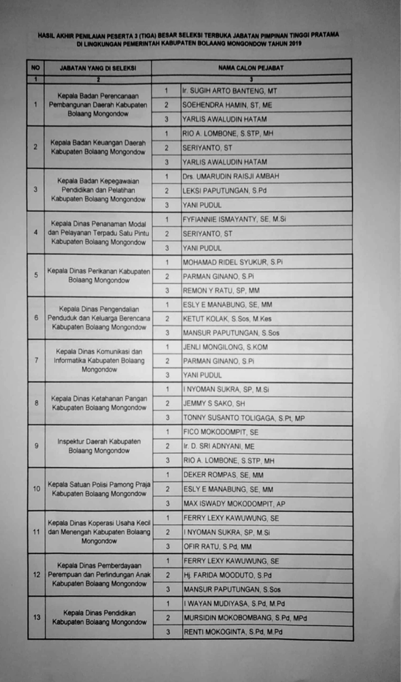 Selasa, (9/7/2019) berdasarkan surat nomor: 10/PANSEl-JPT-BM/2019 yang telah di tandatangani Sekertaris Daerah Bolmong Tahlis Gallang, S, IP.MM, mengumumkan nama – nama yang masuk 3 (tiga) besar pada 18 (delapan belas) jabatan yang diseleksi.
