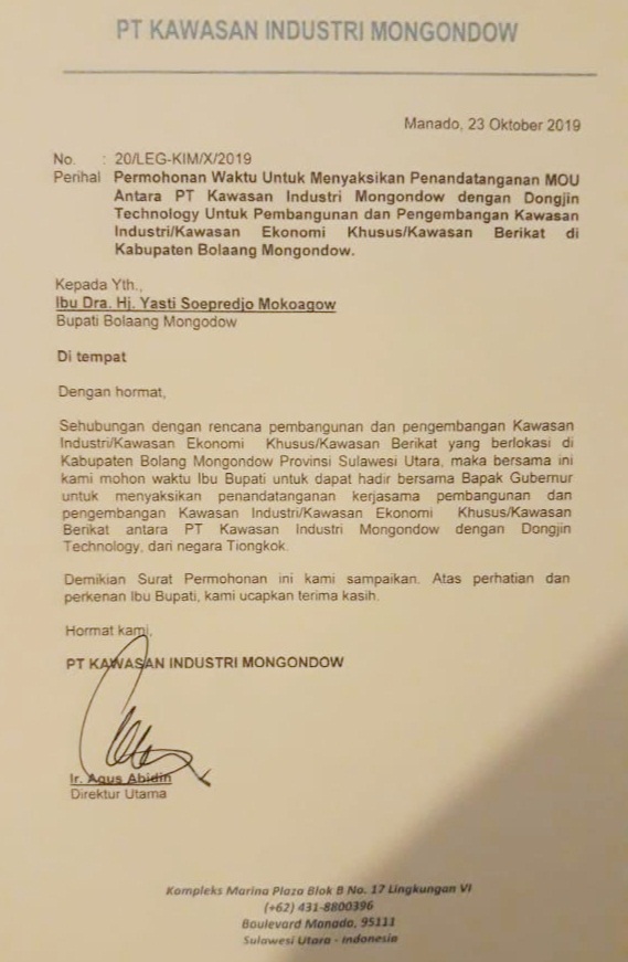 PortalBMR, BOLMONG – Bupati Kabupaten Bolaang Mongondow (Bolmong) Dra, Hj. Yasti Soepredjo Mokoagow. Kamis, (31/10/2019) menyaksikan langsung penandatanganan Memorandum of Understanding (MoU), antara PT Kawasan Industri Mongondow (KIM) dan Dongjin Technology di menado pada pelaksanaan Archipelagic and Island State (AIS).