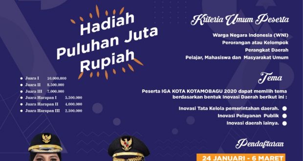 Lebih lanjut ditambahkan, untuk pendaftaran lomba yang berhadiah puluhan juta rupiah ini, dimulai sejak tanggal 24 Januari hingga 6 Maret 2020 bertempat di Kantor bappelitbangda Kota Kotamobagu