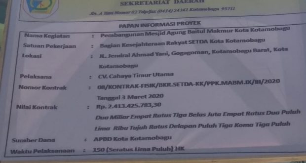 Dikatakannya, proyek yang bersumber dari Anggaran Pendapatan Belanja Daerah (APBD) Kotamobagu ini, bernilai Rp 2,4 M untuk membiayai sejumlah item pekerjaan lanjutan Masjid.