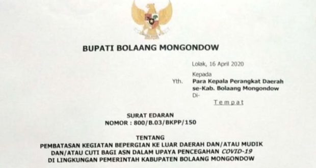 PortalBMR, BOLMONG – Guna mencegah serta memutus mata rantai penyebaran Corona Virus Disease 2019 (Covid-19). Bupati Kabupaten Bolaang Mongondow (Bolmong) Dra, Hj. Yasti Soepredjo Mokoagow kembali mengeluarkan surat edaran tentang pembatasan bepergian ke luar daerah, atau mudik dan cuti bagi Aparatur Sipil Negara (ASN).