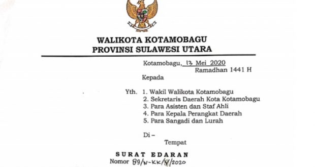Sebagaimana yang tertuang dalam Surat Edaran nomor 89/W-KK/V/2020, tentang perubahan ketiga atas Surat Edaran Walikota Kotamobagu nomor 53/W-KK/III/2020 tentang pengaturan sistem kerja bagi ASN dan THL Pemkot Kotamobagu dalam upaya pencegahan penyebaran Covid-19.
