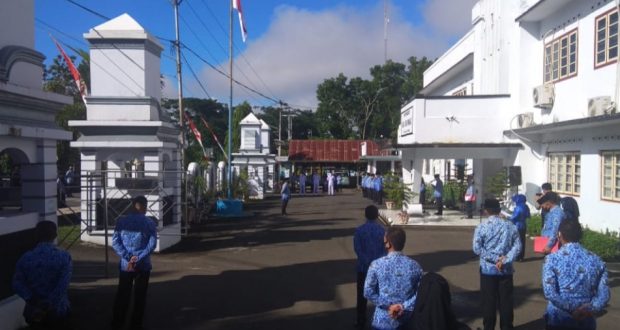 PortalBMR, KOTAMOBAGU — Mewakili Wali Kota Kotamobagu Ir. Tatong Bara, Sekda Kotamobagu Ir. Sande Dodo, MT, memimpin upacara peringatan HUT Ke -56 Provinsi Sulawesi utara dirangkaikan dengan Haornas serta Apel KORPRI di jajaran Pemerintah Kota (Pemkot) Kotamobagu, Rabu (23/9/2020). Berbeda dengan sebelumnya, tahun ini pelaksanaan upacara peringatan HUT Provinsi Sulut, digelar secara sederhana disebabkan pandemi Covid-19. Pesertanya pun dibatasi, hanya diikuti sejumlah organisasi Perangkat Daerah (OPD) lingkup Pemkot Kotamobagu.