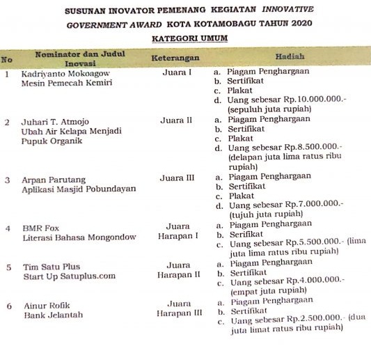 Sebagai informasi, tahapan lomba IGA Kota Kotamobagu ini sendiri digelar sejak 24 Januari hingga 2 Juli 2020 dan diikuti sejumlah 42 inovator yang dibagi dalam dua kategori, yakni kategori umum dan kategori perangkat daerah.
