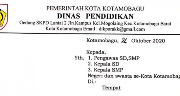 Kebijakan ini tertuang dalam surat edaran Nomor: 400/DISDIK-KK/1424/X/2020 tentang proses belajar mengajar dalam masa darurat Covid-19 di era new normal, yang dilayangkan Dinas Pendidikan (Disdik) Kotamobagu kepada Pengawas SD dan SMP, Kepala SD, Kepala SMP Negeri dan Swasta Se Kota Kotamobagu, tertanggal 26 Oktober 2020.