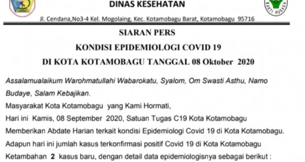 PortalBMR, KOTAMOBAGU – Angka pasien yang terkonfirmasi positif covid-19 di Kota Kotamobagu, Kamis (08/10/2020) hari ini kembali mengalami penambahan. Hal ini menyusul siaran pers yang diterima media ini, dari Satuan Tugas (Satgas) penanganan covid-19 Kota Kotamobagu. Dimana, dari siaran pers tersebut diketahui kalau ada 2 kasus baru, terkait dengan perkembangan covid-19 di daerah tersebut.