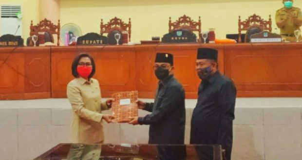 Rapat pun dilanjutkan dengan penandatanganan bersama penetapan Ranperda APBD Bolmong TA 2021 dan Empat Ranperda Inisiatif DPRD Bolmong menjadi Perda, oleh Ketua DPRD Bolmong Welty Komaling, Wakil Ketua I DPRD Sukron Mamonto dan Bupati Bolmong Dra Hj Yasti Soepredjo Mokoagow.