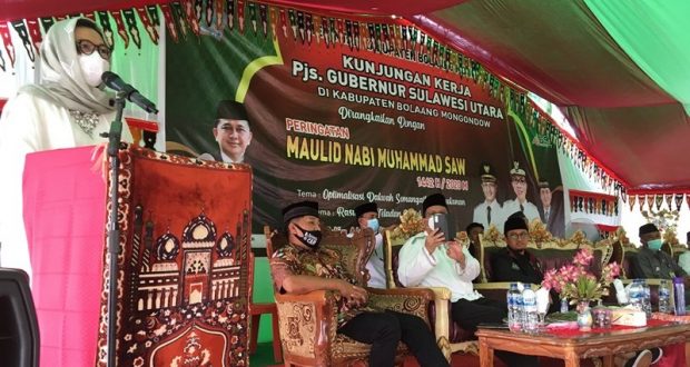 Bupati Bolmong Dra, Hj. Yasti Soepredjo Mokoagow dalam sambutannya mengajak untuk merenungkan, mengapresiasi dan meneladani perjuangan Nabi Muhammad SAW dalam membangun tatanan kehidupan baru di Mekkah dan Madinah, Arab Saudi.