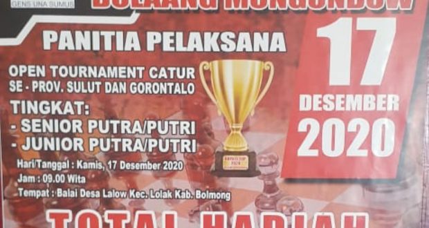 PortalBMR, BOLMONG– Persatuan Catur Seluruh Indonesia (Percasi) cabang Bolmong bekerjasama dengan Pemerintah Kabupaten Bolaang Mongondow (Bolmong) akan melaksanakan Open Tournamen Catur Bupati Bolaang Mongondow (Bolmong) CUP 2020 se-Sulawesi Utara (Sulut) dan Gorontalo.
