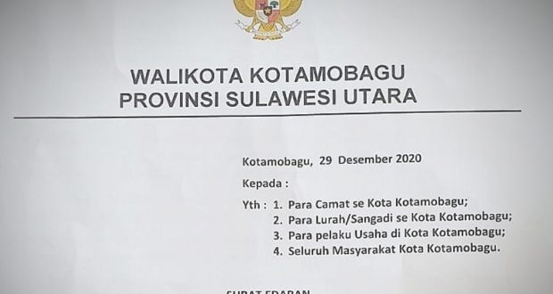 Imbauan ini tertuang dalam Surat Edaran (SE) Nomor 286/W-KK/XII/2020, tertanggal 29 Desember 2020 yang ditandatangani Wali Kota Kotamobagu Ir. Tatong Bara, tentang imbauan pencegahan penularan Covid-19 menjelang malam pisah sambut tahun 2020-2021 di wilayah Kota Kotamobagu.