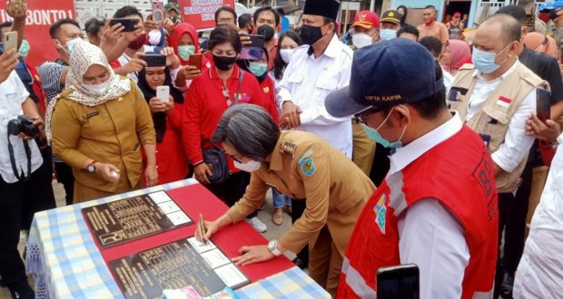 Bupati Bolmong Dra, Hj. Yasti Soepredjo Mokoagow. Selasa, (22/12/2020) bersama Anggota Komisi V DPR RI dari Fraksi PDIP – Perjuangan Hi Herson Mayulu, meresmikan Program Kotaku yang telah tuntas dikerjakan, sekaligus pengguntingan pita dan Penanda Tanganan Prasasti Oleh Kepala Balai Kasatker dan PPK.