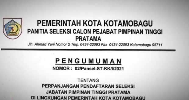 Menyusul diterbitkannya pengumuman nomor: 02/Pansel-ST-KK/I/2021, perihal perpanjangan pendaftaran seleksi Jabatan Pimpinan Tinggi Pratama (JPTP) di lingkungan Pemerintah Kota (Pemkot) Kotamobagu.
