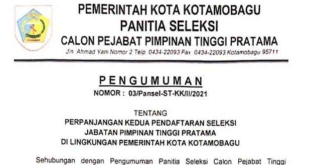 PortalBMR, KOTAMOBAGU — Perpanjangan kedua pendaftaran seleksi Jabatan Pimpinan Tinggi (JPT) Pratama di lingkungan Pemerintah Kota (Pemkot) Kotamobagu kembali dilakukan. Menyusul diterbitkannya pengumuman oleh Panitia Seleksi (Pansel) Nomor 03/Pansel-ST-KK/II/2021, tertanggal 1 Februari 2021.