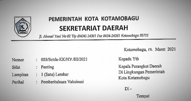“Sehubungan dengan akan dilaksanakan penyuntikan vaksinasi Covid-19 kepada Asn di lingkungan Pemerintah Kota Kotamobagu, maka dengan ini kami memberitahukan kepada Bapak/Ibu jadwal pelaksanaan vaksinasi covid-19 yang akan dimulai pada Senin 15 Maret 2021,” demikian bunyi surat pemberitahuan yang ditandatangan Sekda Kotamobagu Ir Sande Dodo MT.