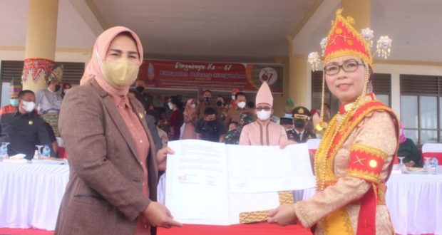 PortalBMR, BOLMONG – Bupati Kabupaten Bolaang Mongondow Dra, Hj. Yasti Sooredjo Mokoagow Usai memimpin upacara HUT ke-67 Kabupaten Bolaang Mongondow. Selasa, (23/03/2021) menyerahkan Asset Pemerintah Kota Kotamobagu.