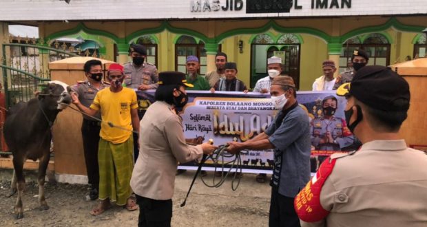 Untuk Penyaluran hewan kurban telah didistribusikan oleh Kapolres Bolmong AKBP Dr. NOVA IRONE SURENTU kepada Pengurus Masjid Nurul Iman melalui lingkungan masjid dan pemukiman masyarakat, dan Seluruh proses penyerahan dan penyembelihan hewan serta pembagian daging kurban tetap mengikuti dan mematuhi protokol pencegahan COVID-19.