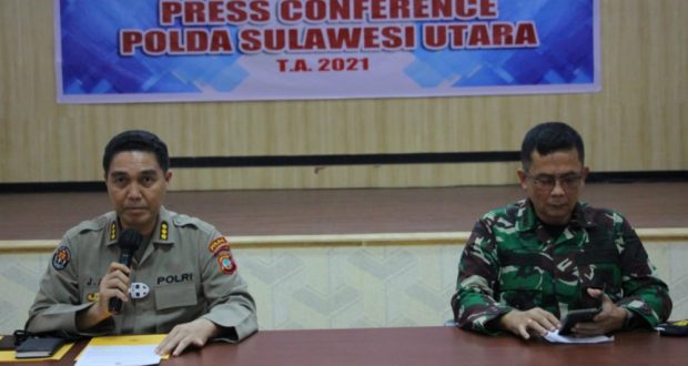 Press conference dihadiri oleh Kabid Humas Polda Sulut Kombes Pol Jules Abraham Abast, Asintel Kodam XIII/Merdeka Kolonel Kav Kapti Hertantyawan, Kapendam XIII/Merdeka Letkol Inf Jhonson Sitorus, Selasa (21/09/2021) siang, di ruang Catur Prasetya Mapolda Sulut.