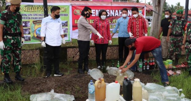 PortalBMR, BOLMONG – Polres Bolaang Mongondow yang di pimpin AKBP Nova Surentu SH MH. Kamis, (23/12/2021) melakukan pemusnahan barang bukti jenis minuman beralkohol (minol), obat-obatan terlarang, kosmetik dan makanan yang sudah kadaluarsa.
