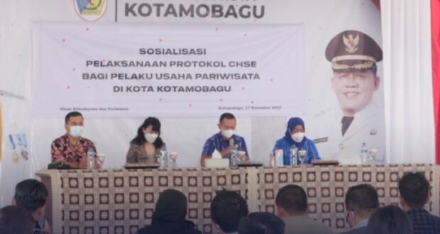 Dikatahui, Kegiatan ini menghadirkan Kepala Bidang Pengembangan Industri, Dinas Pariwisata Daerah Provinsi Sulawesi Utara, Fany J. Mathewus, SP.,M.Si., Assesor Nasioanal BNSP Uji Kompetensi Pariwisata Sam Tampusu, Kepala Dinas Kebudayaan Kota Kotamobagu Anki Taurina Mokoginta, ST.,ME., dan Peserta Sosialisasi Pelaksanaan Protokol CHSE ( Cleanliness, Health, Safety and Environment Sustainability).