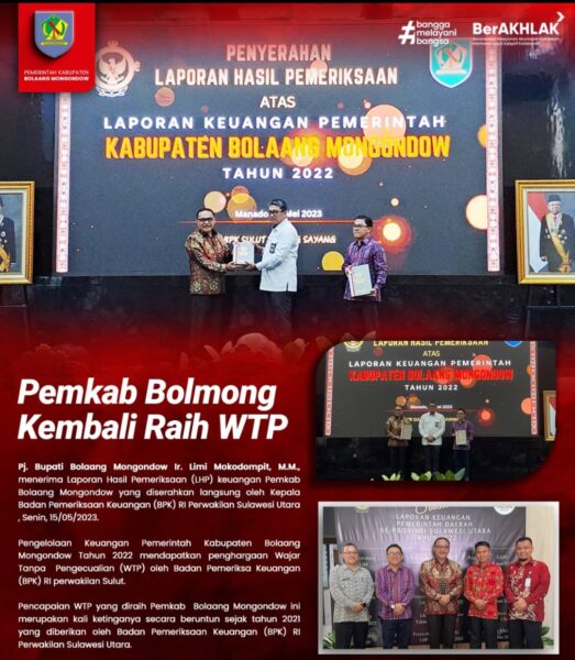 Sebelum penyerahan hasil pemeriksaan Kepala BPK RI Perwakilan Sulut Arief Fadillah S.E., M.M., CSFA, mengumumkan bahwa Pemkab Bolmong kembali meraih opini Wajar Tanpa Pengecualian (WTP).