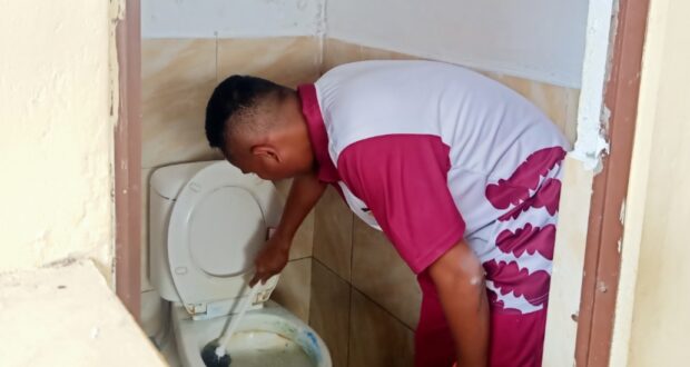PortalBMR KOTAMOBAGU – Wakapolres Kotamobagu Kompol Arie Prakoso S.I.K didampingi Kabag SDM AKP Donald Ngalimin tiba – tiba masuk Toilet umum polres kotamobagu bersama alat pembersih toilet dan langsung melakukan pembersihan Toilet Umum polres Kotamobagu.