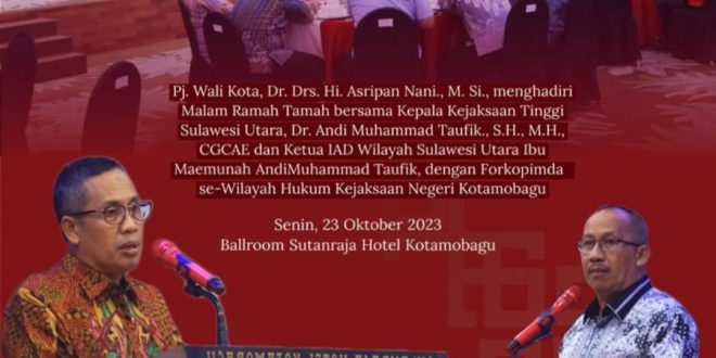 PortalBMR KOTAMOBAGU – Pj. Wali Kota, Dr. Drs. Hi. Asripan Nani., M.Si menghadiri Malam Ramah Tamah Kepala Kejaksaan Tinggi Sulawesi Utara, Dr. Andi Muhammad Taufik., S.H., M.H., CGCAE dan Ketua IAD Wilayah Sulawesi Utara, Ibu. Maemunah Andi Muhammad Taufik dengan Forkopimda se – wilayah Hukum Kejaksaan Negeri Kotamobagu. Senin 22 Oktober 2023 si Ballroom Sutanraja Hotel Kotamobagu.