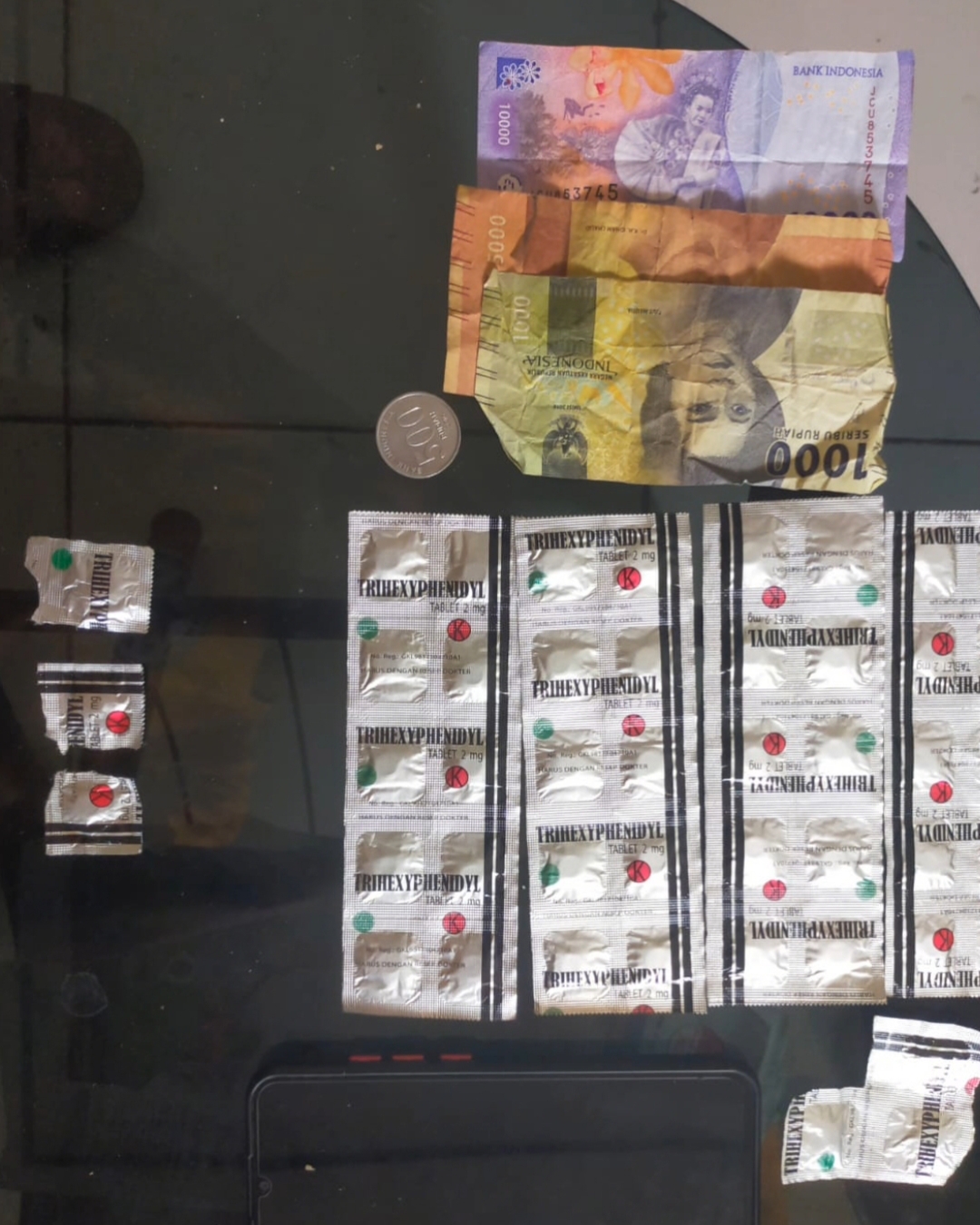 Senin, 15 Januari 2024 saat patroli pukul 02:00 wita Tim presisi mendapati dua pemuda yang mencurigakan di pinggiran jalan, setelah di cek oleh tim presisi, di dapati sejumlah obat terlarang jenis Trihexyphenidyl