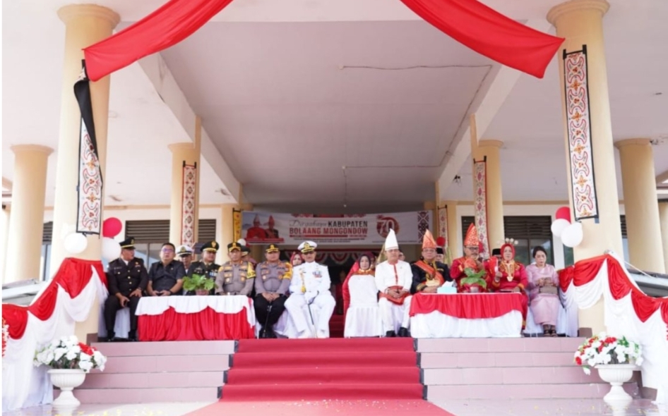 Penjabat Bupati (Pj) Ir Limi Mokodompit MM, bertindak sebagai Inspektur Upacara (Irup) di Hut tersebut, dengan menggunakan pakaian adat khas daerah Bolaang Mongondow di dampingi istri tercintanya.