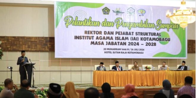 PortalBMR KOTAMOBAGU – Pj Wali Kota, Dr. Drs. Hi. Asripan Nani., M.Si Hadiri Pelantikan dan Pengambilan Sumpah Rektor dan Pejabat Struktural Institut Agama Islam (IAI) Kotamobagu Masa Jabatan 2024 – 2028. Jumat 26 Juli 2024 di Ballroom Sutanraja Hotel, Kotamobagu
